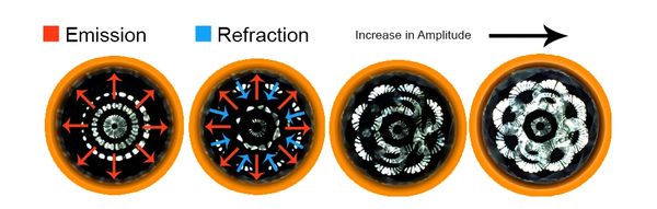 A cylindrical vessel containing liquid sits upon a vibrating speaker. Like ripples in a pond, the vibrations create visible distortions on the liquid surface. Those ripples reach the walls of the vessel and bounce back inward creating a collision of energy. Light is then used to reveal the patterns created by these sonic collisions.