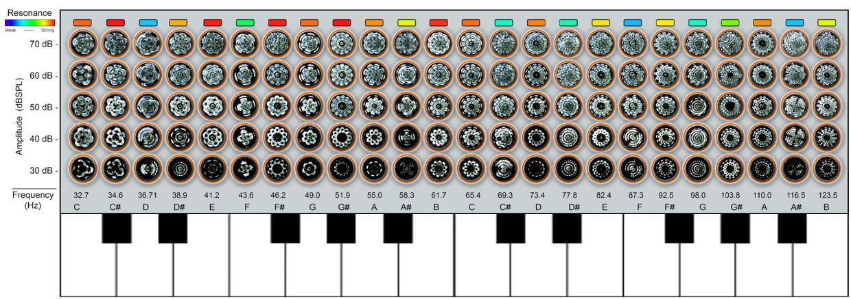 Experiments were conducted in order to generate a library of cymatic images that could be mapped to musical tones and pitches. Carsecka uses this library to assemble musical compositions featuring specific patterns that are projected onto a screen during the live performance. The chart above displays the cymatic signatures of the first two octaves of the piano keyboard along with the note names and frequencies associated with those tones. The frequency of the waveform determines the overall geometry of the patterns (specifically the number of points) while amplitude controls their complexity. A waveform’s resonance, or physical balance within the vessel, determines the stability of the pattern as well as that pattern’s ability to achieve more complex arrangements as amplitude is increased.